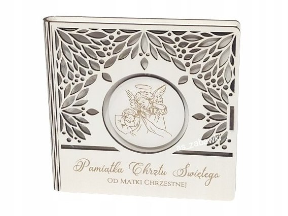 Eleganckie, drewniane pudełko z życzeniami na CHRZEST ŚWIĘTY ze specjalną dedykacją od Matki Chrzestnej.