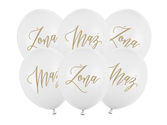 Balony Strong, Pastel Pure White ze złotym dwustronnym nadrukiem: Żona (3 szt.) i Mąż (3 szt.), średnica 30 cm.