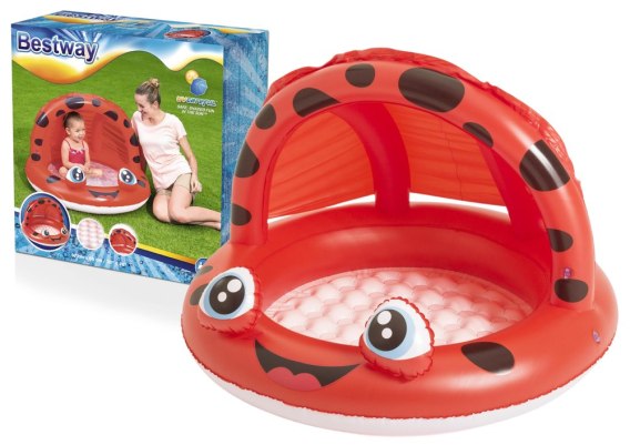 Dmuchany brodzik to idealnie rozwiązanie dla maluszków w upalne dni. Jest łatwy do nadmuchania, opróżniania i przechowywania przy czym świetnie sprawdza się podczas pierwszego kontaktu dzieci z wodą. Basen jest w motywie czerwonej żabki z pewnością przyciągnie wzrok i spodoba się najmłodszym. Ściany boczne zapewniają dzieciom bezpieczeństwo i ułatwiają monitorowanie ich zabawy. Dmuchany daszek skutecznie ochroni przed promieniami słonecznymi.