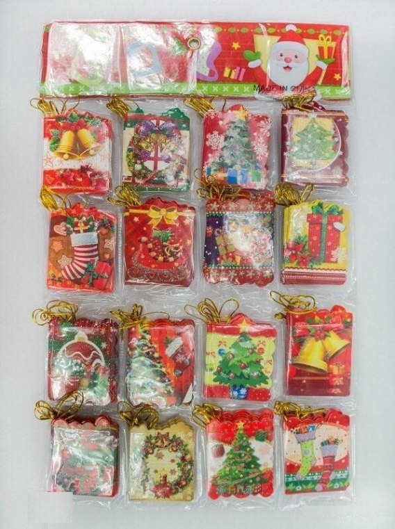 Opakowanie z bilecikami prezentowymi umieszczonymi w kieszonkach, którą można łatwo zawiesić. Wszystkie bileciki z motywem bożonarodzeniowym, idealne jako dodatek do prezentu pod choinkę. Zawierają pozłacany sznurek do łatwego mocowania. Każdy bilecik w rozmiarze około 5,5 x 7 cm.