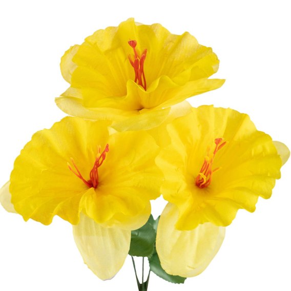 Bukiet sztucznych kwiatów. 3 żonkile na elastycznych gałązkach z listkami. Element stroików, bukietów i dekoracji wielkanocnych, wiosennych. Kwiaty w kolorze żółtym.