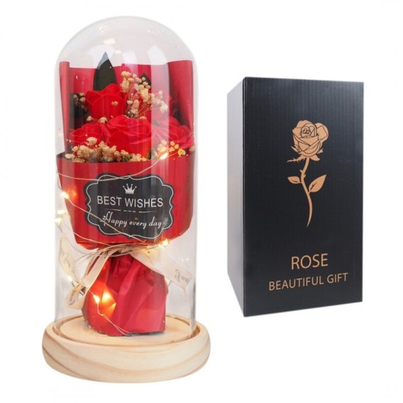 Bukiet kwiatów w szklanej kopule, róże na prezent, świecące LED ROZ19