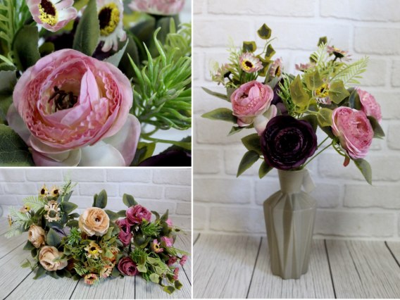Bukiet sztuczny drobne PIWONIE z dużą ilością zielonych dodatków (wys. 45 cm, kwiat 7,5 cm) EK-104