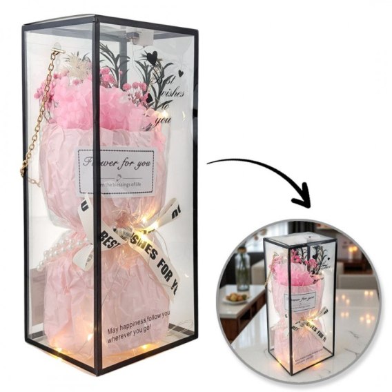 - Możliwość włączania i wyłączania lampek. Materiał: kwiaty mydlane i naturalne/ opakowanie z tworzywa sztucznego. Wymiary bukietu: