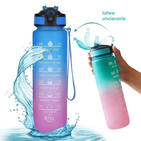 Butelka na wodę, bidon z miarką i słomką 1L OMBRE Niebieski z Fuksją BD18