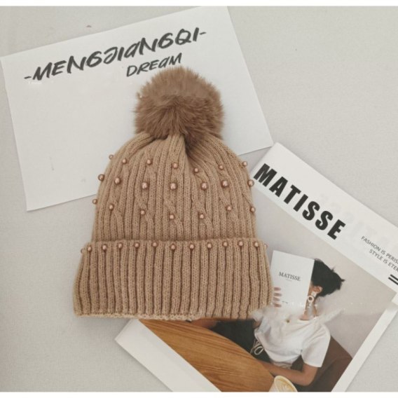 Czapka zimowa dzianinowa, miękka i ciepła, z pomponem i perełkamiBardzo ciepła i elastyczna czapkaIdealna do zimowych stylizacji Świetnie sprawdza się jako modny dodatek lubokrycie głowy podczas zimowych aktywności fizycznychRozmiar: uniwersalnySkład:Akryl 100%