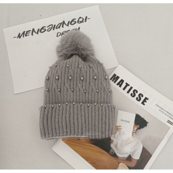 Czapka zimowa dzianinowa, miękka i ciepła, z pomponem i perełkami Bardzo ciepła i elastyczna czapka