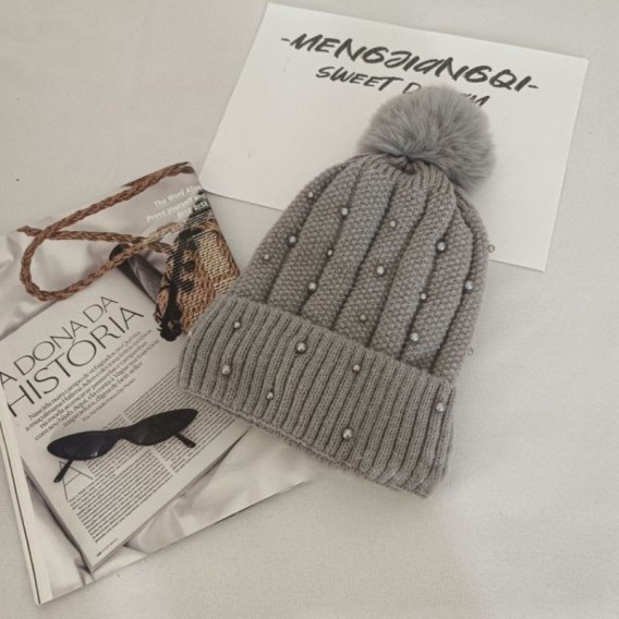 Czapka zimowa dzianinowa, miękka i ciepła, z pomponem i perełkami Bardzo ciepła i elastyczna czapka