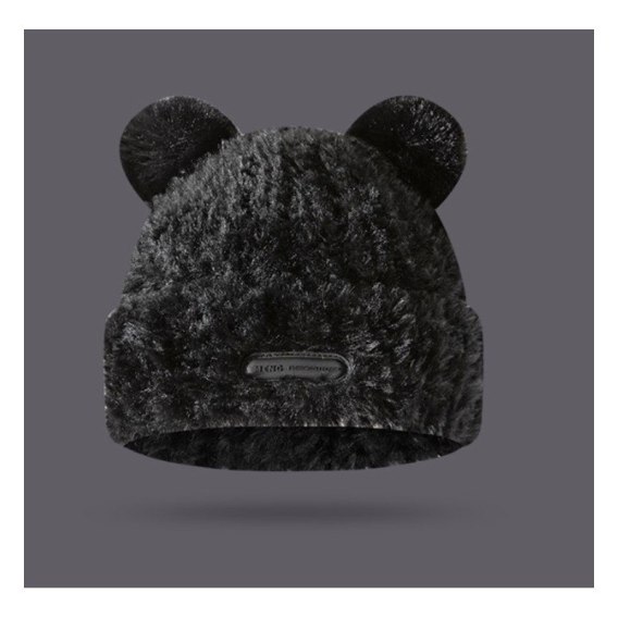 Czapka zimowa pluszowa z uszami misia, miękka i ciepła, z naszywką, czarna Bardzo ciepła i elastyczna czapka