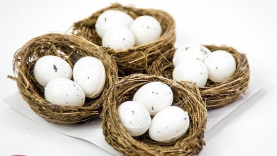 Naturalnie wyglądające gniazdka z białymi jajeczkami. Świetnie nadają się do dekoracji domu na Wielkanoc lub jako element stroiku.