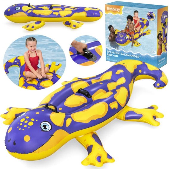Dmuchany kolorowy materac w kształcie salamandry to najnowsza propozycja firmy Bestway na nadchodzące lato. Ciekawa grafika, żywe kolory i nietypowy kształt na pewno spodoba się każdemu dziecku. Duży rozmiar materaca 191 x 119 cm oraz jego wykonanie sprawiają, że na grzbiecie salamandry spokojnie zmieści się dwoje dzieci. Materac posiada również 2 mocne uchwyty do trzymania, dzięki którym dzieciom łatwiej utrzymać się na nim podczas zabawy. Uchwyt można również wykorzystać podczas przenoszenia materaca.