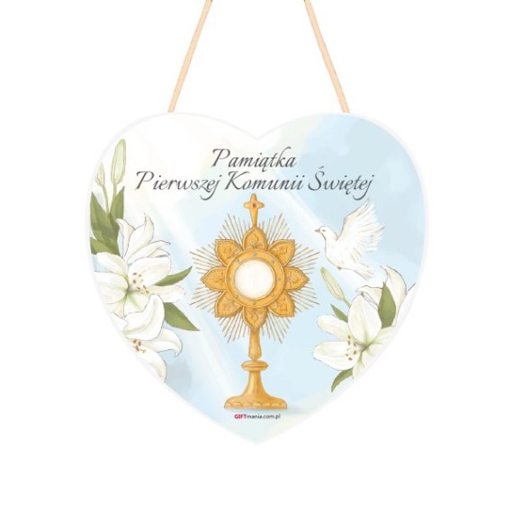 Drewniana tabliczka w kształcie serca druk UV z napisem "Pamiątka Pierwszej Komunii Świętej"