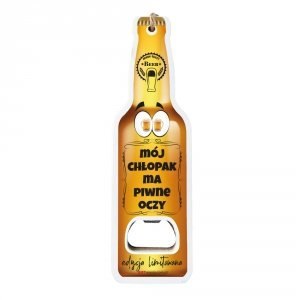 Drewniany mały otwieracz zawieszka z napisem "Mój chłopak ma piwne oczy"