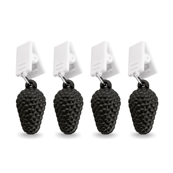Zestaw ten zawiera cztery obciążniki do obrusów. Każdy z nich bez problemu zamocujesz do materiału, niezależnie od jego kształtu lub grubości. Jest to możliwe dzięki praktycznym klipsom-żabkom. Ciężarki zostały natomiast wystylizowane na małe, urocze owoce, co uniwersalnie dopasuje je do każdej okazji i przyjęcia.