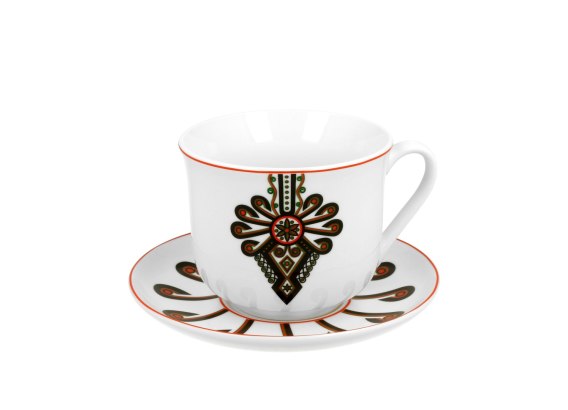 Linia zdobiona typowo regionalnym motywem podhala - haftu parzenicy w intensywnym kolorze czarno-czerwonym idealnie komponujacym się z białym tłem porcelany.
