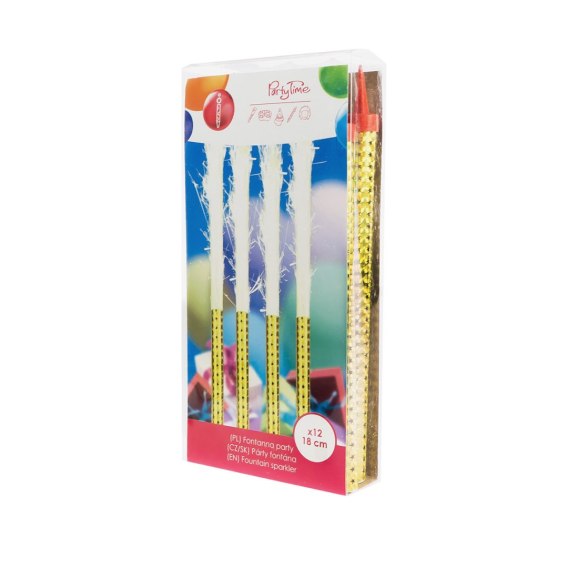 12 fontann w opakowaniu. Fontanna o wysokości 18 cm. Po odpaleniu wyrzuca złote iskierki. Idealne podczas świętowania uroczystości takich jak urodziny, ślub, jubileusz.