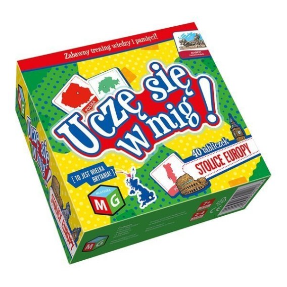 "UCZĘ SIĘ W MIG - STOLICE EUROPY" to wspaniała gra, która rozwinie pamięć i spostrzegawczość Twojego dziecka. Dodatkowo poszerzy jego wiedzę z zakresu geografii i pomoże obudzić w nim maturę prawdziwego podróżnika zapewniając przy tym dużo dobrej zabawy i emocji. W grze wygrywa ten, kto najlepiej zapamięta położenie par państw i ich stolic, odkrytych na chwilę, spośród wszystkich ilustrowanych tabliczek leżących na stole rewersem do góry. Odkrywaj wiele wspaniałych miejsc i zdobywaj wiedzę o naszych europejskich sąsiadach. Zawartość opakowania: ilustrowane tabliczki - 40szt, instrukcja