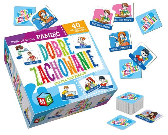 ""Dobre Zachowanie " to gra rozwijająca pamięć, koordynację wzrokową i spostrzegawczość. Sprawdź, czy dasz radę zapamiętać wszystkie obrazki! W grze wygrywa ten, kto najlepiej zapamięta położenie tabliczek z przykładami wzorowego zachowania, odkrytych na chwilę, spośród wszystkich ilustrowanych tabliczek leżących na stole rewersem do góry. Gra uczy przykładów dobrego zachowania, pomagając utrwalać pozytywne wzorce przekazywane przez rodziców i szkołę. Pozytywnie wpływa na rozwój i zachowanie dziecka.