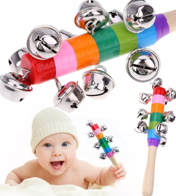 Metalowe dzwoneczki na drewnianym uchwycie wprowadzą dziecko w świat muzyki. Idealne do tańców, zabaw i na rytmikę.