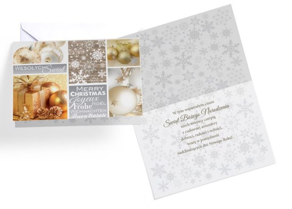 Kartka wielkości B6, zdobiona w zależności od wzoru metaliczną folią lub brokatem. Każda kartka posiada kolorowe życzenia w środku i koperte.