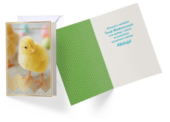 Kartka posiada tekst w środku, dołączona jest do niej koperta.