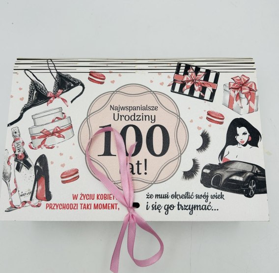 Pudełko z sześcioma przegródkami na gadżety dla kobiety z okazji urodzin. Kolorowy nadruk z życzeniami. Pudełko w przegródkach wypełnione wełną drzewną i żetonami na różne okazje.
