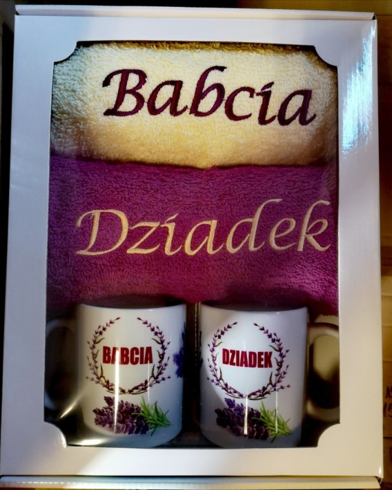 Komplet kubków lawenda + ręczniki Babcia Dziadek