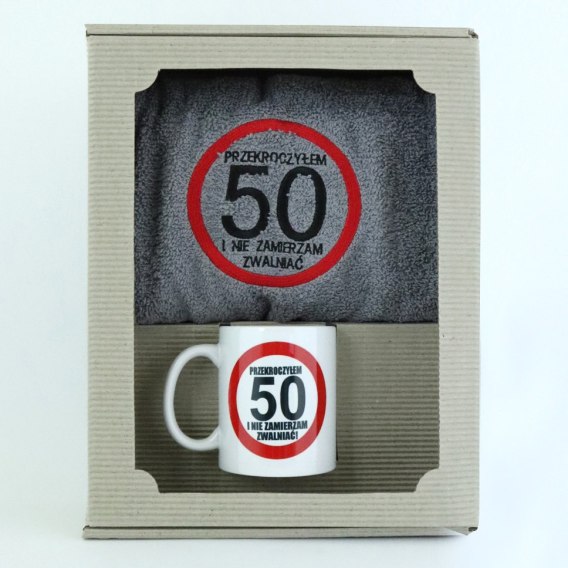Kpl.ręcznik+kubek w pudełku ''PRZEKROCZYŁEM 50..''