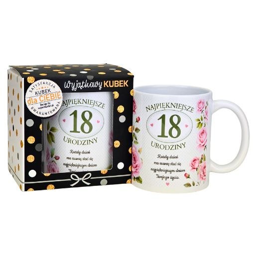 Taki kubek 18-stkowy sprawdzi się nie tylko jako prezent od rodziny, lecz również jako upominek od przyjaciół, koleżanek czy znajomych. Dzięki uniwersalnemu wzorowi oraz trwałemu wykonaniu będzie cieszył obdarowaną osobę przez długie lata.