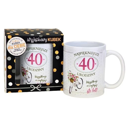 Taki kubek 40-stkowy sprawdzi się nie tylko jako prezent od rodziny, lecz również jako upominek od przyjaciół, koleżanek czy znajomych. Dzięki uniwersalnemu wzorowi oraz trwałemu wykonaniu będzie cieszył obdarowaną osobę przez długie lata.