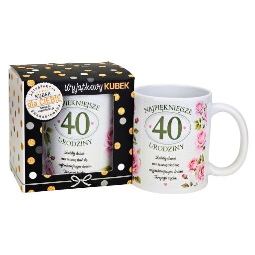 Taki kubek 40-stkowy sprawdzi się nie tylko jako prezent od rodziny, lecz również jako upominek od przyjaciół, koleżanek czy znajomych. Dzięki uniwersalnemu wzorowi oraz trwałemu wykonaniu będzie cieszył obdarowaną osobę przez długie lata.