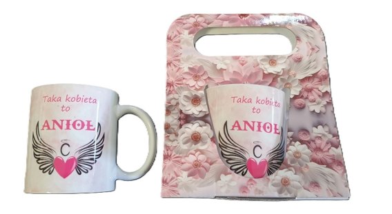 Kubek w kartoniku z nadrukiem dookoła Taka Kobieta to Anioł DK8
