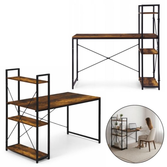 Loftowe biurko komputerowe z regałem, półkami, 120 x 60cm, czarne, brązowy blat STL24BR