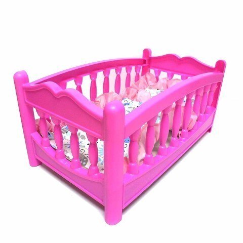 Prezentowane łóżeczko ma 45 cm długości i biało różowe szczebelki.
