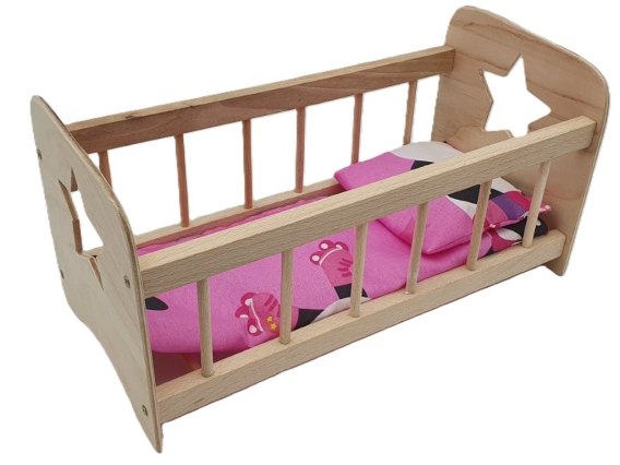 Łóżeczko wykonane z drewna, nielakierowane. Pościel z tkanin w różnych kolorach. Przeznaczone dla dziewczynek od 3 lat.