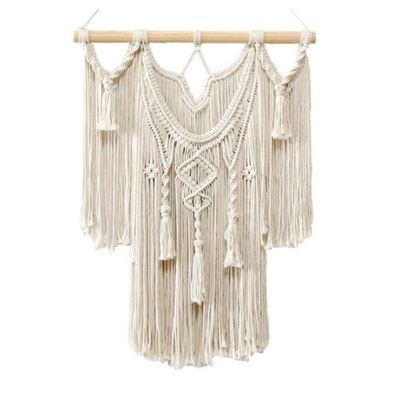 Piękna makrama w klimacie boho pasująca do wielu wnętrz Ozdoba możliwa również do zastosowania do sesji fotograficznych czy jako dekoracja przy wielu tematycznych uroczystościach Makrama wyplatana z bawełnianego sznurka plecionego o grubości 5 mm. Wymiary:
