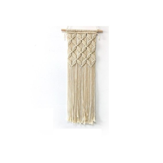 Piękna makrama w klimacie boho pasująca do wielu wnętrzOzdoba możliwa również do zastosowania do sesji fotograficznych czy jako dekoracja przy wielu tematycznych uroczystościachMakrama wyplatana z bawełnianego sznurka plecionego o grubości 5 mm.Wymiary:26 x 78 cm (ze sznurkiem 110 cm)