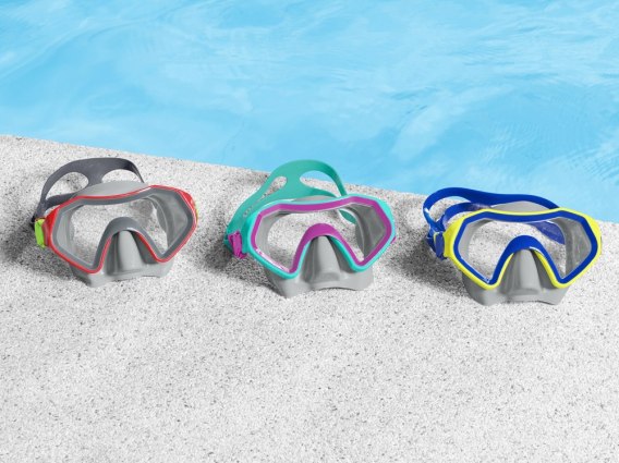 Kolorowa Maska do pływania Bestway® Crusader Mask została przeznaczona dla dzieci już od 7 roku życia i z pewnością sprawdzi się podczas pierwszych lekcji pływania. Została stworzona z myślą o komforcie i bezpieczeństwie najmłodszych pociech w czasie morskich odkryć. Dzięki regulowanym paskom maska bez problemu będzie mogła zostać dopasowana do głowy użytkownika. Maska została wykonana z poliwęglanu, dzięki czemu jest odporna na uderzenia. Posiada powłokę chroniącą przed promieniowaniem UV, chroniąc oczy dziecka przed ostrymi promieniami słonecznymi oraz podczas zanurzania się i nurkowania w wodzie.