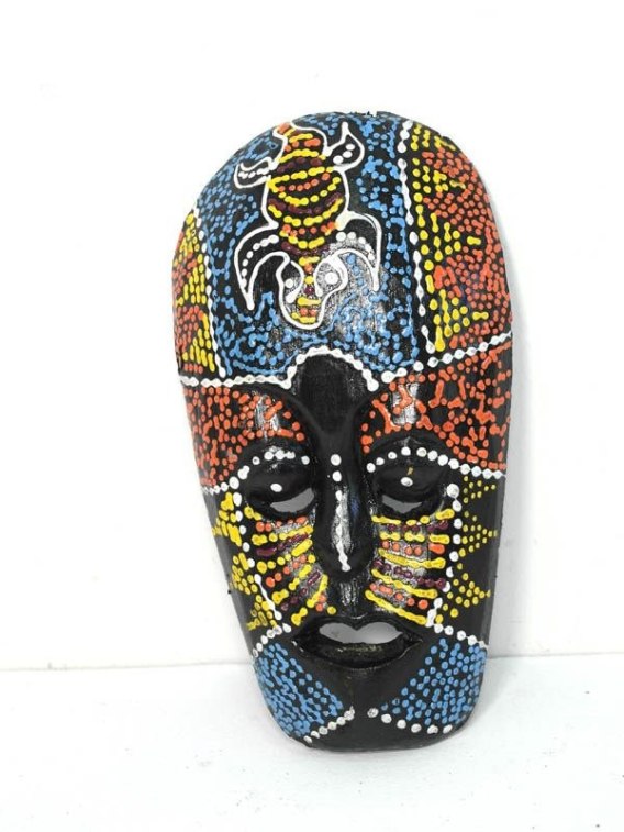 Ręcznie wykonana na wyspie Bali w Indonezji drewniana maska. Malowana kropkami farby. Motyw malowania może być inny na każdej masce .Wysokość 20 cm. Materiał- drewno balsa.