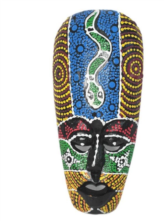 Ręcznie wykonana na wyspie Bali w Indonezji drewniana maska. Długość 25 cm. Malowana kropkami farby. Motyw malowania może być różny na każdej masce.