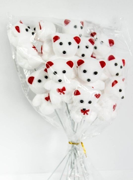 Biały 6cm miś z czerwonymi uszkami na piku z giętkiego drutu o długości 17cm. W opakowaniu 12 szt. zapakowanych w folię. Cena za opakowanie.
