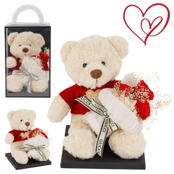 Ten elegancki pluszowy miś z bukietem PACHNĄCYCH czerwonych róż w stylowym pudełku to doskonały wybór !