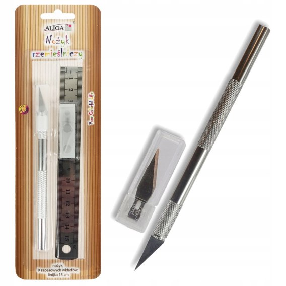 Nożyk rzemieślniczy 9 zapasowych wkładów linijka 15cm.