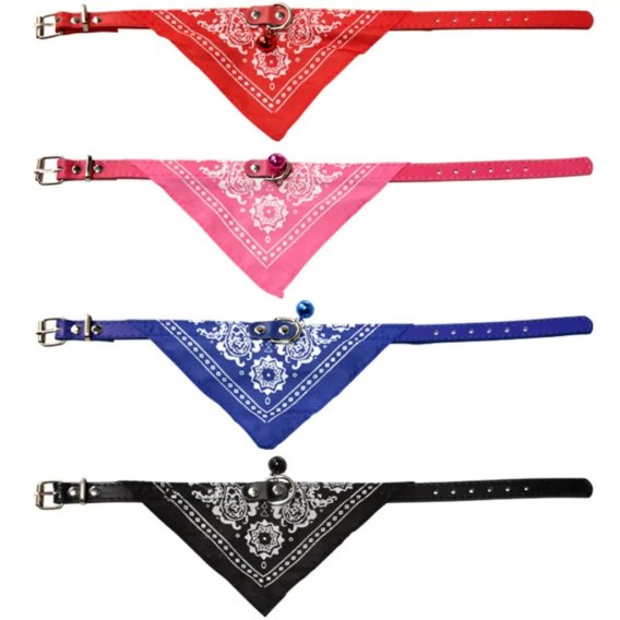 · mocna skóropodobna obroża na szyję dla średnich i większych psów, z naszytą pośrodku trójkątną chustką arabską bandanką oraz ze stalowym zapięciem i kółkiem do zapinania smyczy