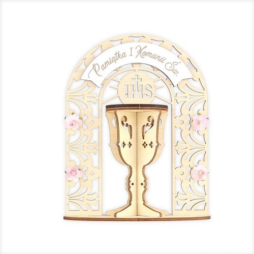 Pamiątka drewniana kielich I Komunia Święta RÓŻOWY