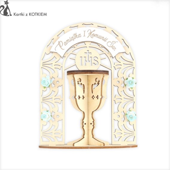 Elegancka pamiątka z okazji przyjęcia I Komunii Świętej w formie kielicha ze sklejki drewnianej.