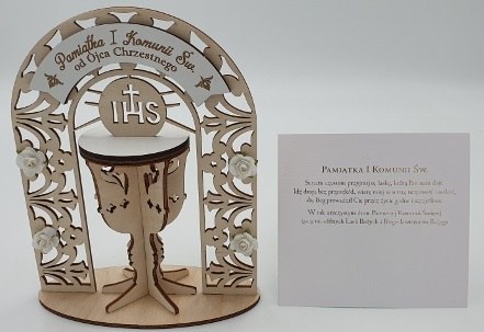Pamiątka drewniana kielich od OJCA CHRZESTNEGO I KOMUNIA ŚW.