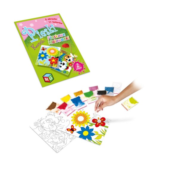 Twoje dziecko nudzi już tradycyjne malowanie farbami lub kredkami? Zapewnij mu świetną zabawę, która wciągnie je na długie godziny. Przyjemna w dotyku forma piasku sprawia, że wszyscy chętnie się nim bawią. Teraz jednak można dać upust swojej wyobraźni i wykorzystać go do stworzenia niezwykłych rysunków. Odkryj jeden element, przysyp go odpowiednim kolorem, jeszcze chwila cierpliwości i gotowe! Zobacz, jak szybko ilustracje nabierają pięknych, wyrazistych barw. Popuść wodze swojej fantazji i oczaruj najbliższych pięknymi obrazkami. To nie tylko świetna rozrywka, ale także ćwiczenie z kreatywności i zdolności manualnych. Format obrazków: A5.