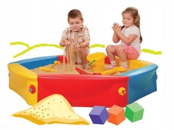 Piaskownica wykonana jest z 6 modułów z bardzo wytrzymałego tworzywa odpornego na działanie czynników atmosferycznych. Moduły są montowane w łatwy i wygodny sposób za pomocą śrub z kolorowymi nakrętkami.