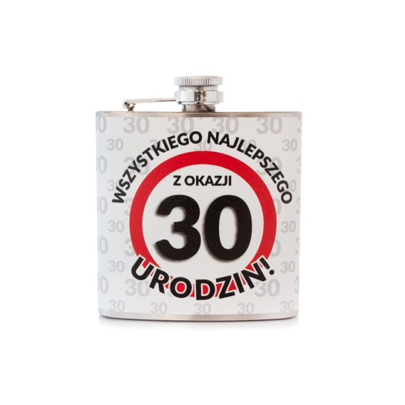 Piersiówka ze stali nierdzewnej. Metalowy korek, opakowanie PCV.